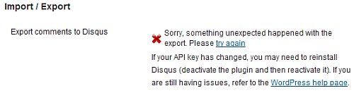 But the WordPress export feature did not work as smoothly as expected. We downloaded the file and uploaded it to Disqus import, but the file would simply not import stating that it had errors. We checked at the bottom of exported file and found the following error