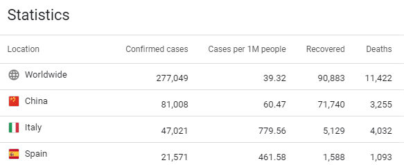 Now Google Coronavirus Map is also online. It seems to source data from WHO and Wikipedia it seems. Instead of color circle size, they have used darker blue color coding for larger numbers. Hovering over the country, will give number of confirmed cases..